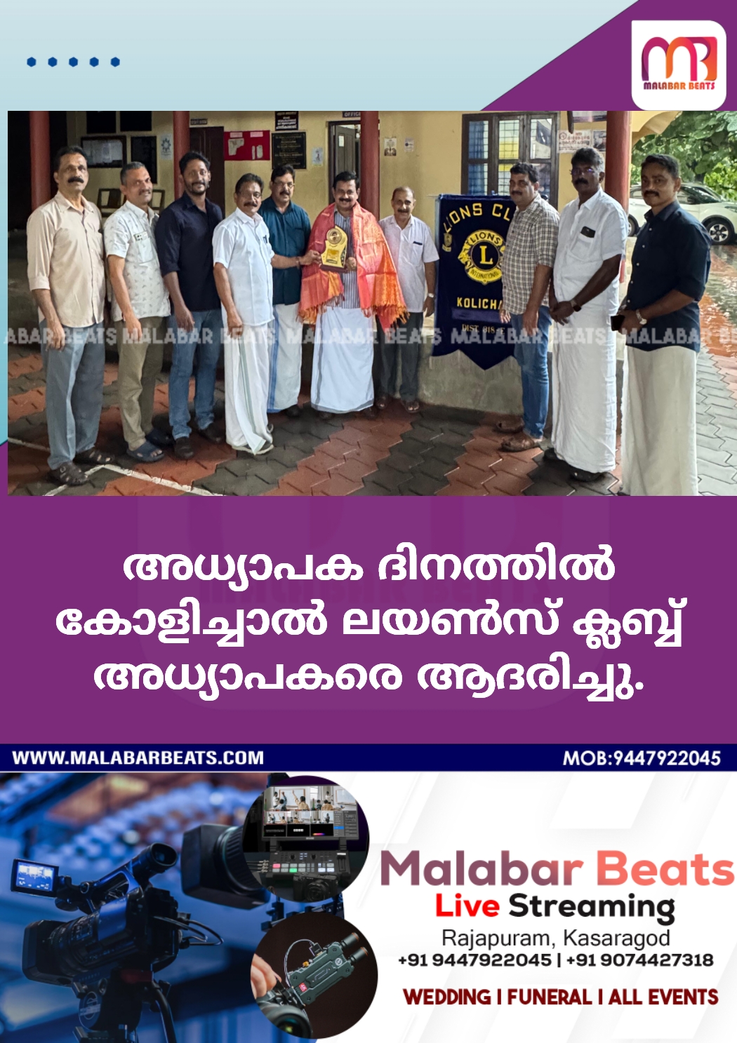 രാജപുരം: അധ്യാപക ദിനത്തിൽ കോളിച്ചാൽ ലയൺസ് ക്ലബ്ബ് അധ്യാപകരായ സജി എം എ , റിട്ടയേഡ് അധ്യാപിക കെ എം മോളി , സാലു ഐലാറ്റിൽ എന്നിവരെ പൊന്നാടയും മൊമെന്റോയും നൽകി ആദരിച്ചു. ചടങ്ങിൽ ലയൺസ് ക്ലബ്ബ് പ്രസിഡൻ്റ് ഒ സി ജോസഫ്, സെക്രട്ടറി ജയകുമാർ എപി , കണ്ണൻ നായർ, അഷറഫ് തുടങ്ങിയവർ സംബന്ധിച്ചു.