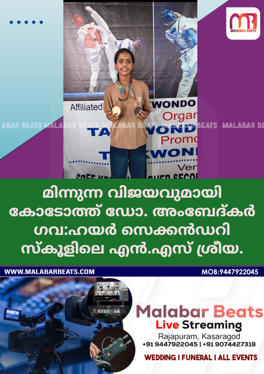 പൂം സെയിൽ 41 കിലോ പെൺകുട്ടികളുടെ വിഭാഗത്തിൽ സംസ്ഥാന തലത്തിൽ സ്വർണ്ണവും ഫയറ്റിംഗിൽ വെങ്കലവും നേടി എൻ.എസ്. ശ്രിയ കോടോത്തിൻ്റെ അഭിമാന താരമായി