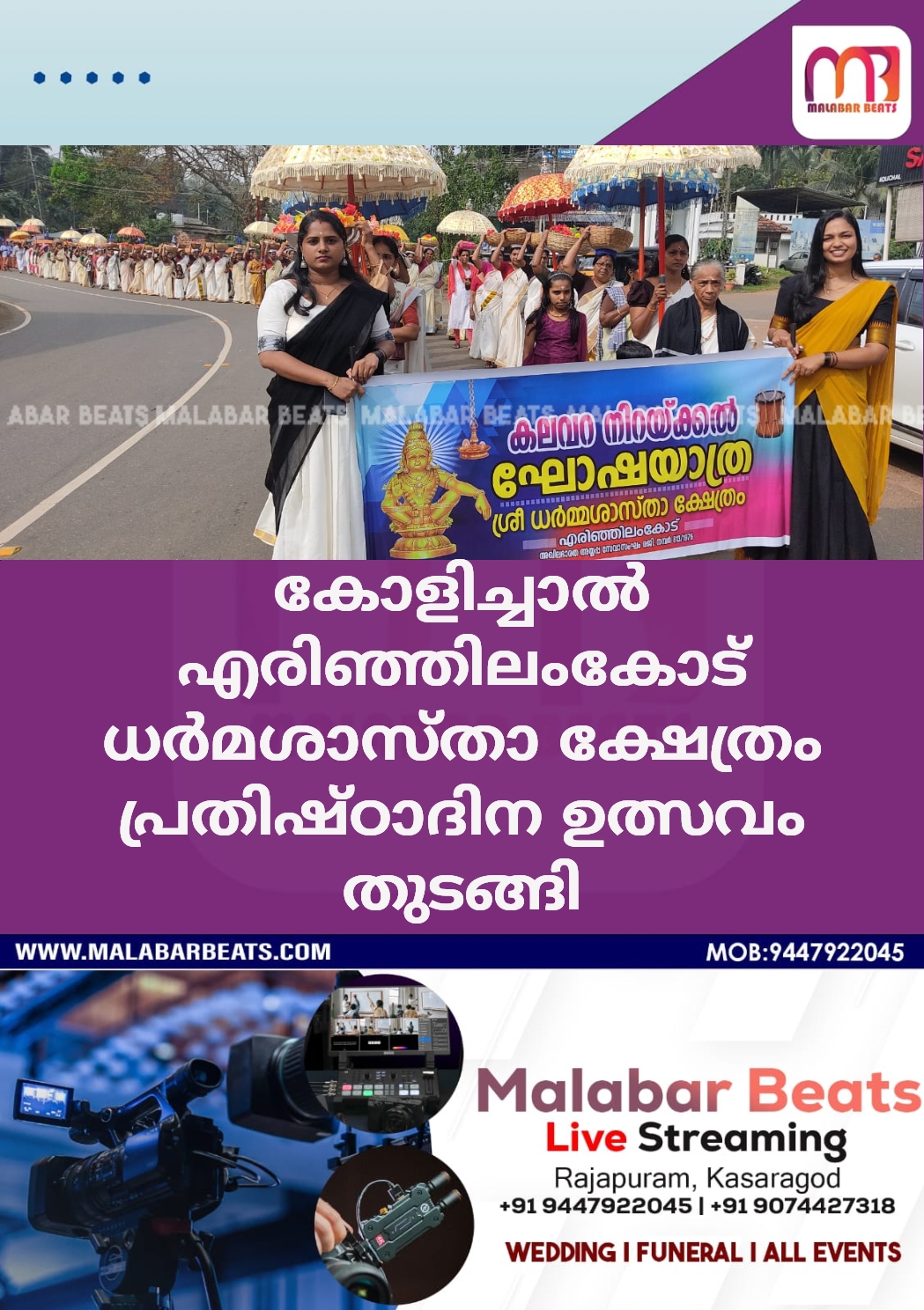 ധർമശാസ്‌താ ക്ഷേത്രം പ്രതിഷ്‌ഠാദിന ഉത്സവം തുടങ്ങി. ഇന്നു രാവിലെ 10 മണിക്ക് കോളിച്ചാൽ മുത്തപ്പൻ മടപ്പുരയിൽ നിന്നും ക്ഷേത്രത്തിലേക്ക് കലവറ ഘോഷയാത്ര നടന്നു. തുടർന്ന് മാതൃസംഗമം, ഭജന, സംഗീതാർച്ചന എന്നിവ നടന്നു. നാളെ ഡിസംബർ 7ന് രാവിലെ 5.30ന് നടതുറക്കൽ, 6 മണിക്ക് വിവിധ പൂജകൾ നടന്നു, 9.30ന് നെയ്യഭിഷേകം, തുടർന്ന് സോപാന സംഗീതം, 1.30ന് മഹാപൂജ, അന്നദാനം. വൈകിട്ട് 6.45ന് ഭജന, 7മണിക്ക് കോളിച്ചാൽ മുത്തപ്പൻ മടപ്പുരയിൽ നിന്ന് ക്ഷേത്രത്തിലേക്ക് ഘോഷയാത്ര, 8.30ന് ഘോഷ യാത്രയ്ക്ക് ക്ഷേത്രത്തിൽ സ്വീകരണം, തുടർന്ന് അത്താഴപൂജ, 9 മണിക്ക് ഫ്ലവേഴ്സ് ഫെയിം മഹേഷ് നായിക്കുന്ന ഭക്തിഗാനസുധയോടെ സമാപനം