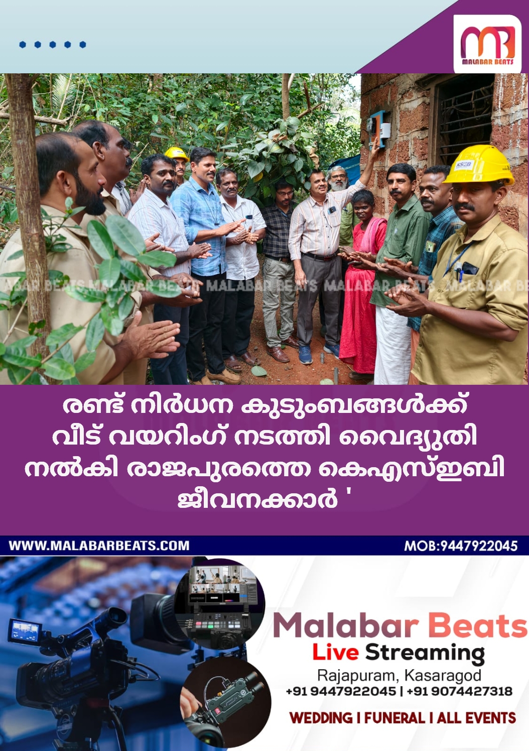 രാജപുരം : രണ്ട് നിർധന കുടുംബങ്ങൾക്ക് വീട് വയറിംഗ് നടത്തി വൈദ്യുതി നൽകി രാജപുരത്തെ കെഎസ്ഇബി ജീവനക്കാർ മാതൃകയായി, പതിനായിരം രൂപയോളം ചെലവഴിച്ചാണ് വൈദ്യുതീകരണം നടത്തിയത്, അസിസ്റ്റന്റ് എക്സിക്യൂട്ടീവ് എഞ്ചിനീയർ സന്തോഷ് കുമാർ സ്വിച്ച് ഓൺ കർമം നിർവഹിച്ചു, അസിസ്റ്റന്റ് എഞ്ചിനീയർ സുനീഷ്, സബ് എഞ്ചിനീയർമാരായ അനിൽകുമാർ, ബാബു, ജോജൻ വാർഡ് മെമ്പർ സുരേഷ് വയമ്പ് മുൻ മെമ്പർ കുഞ്ഞികൃഷ്ണൻ എന്നിവർ പങ്കെടുത്തു. സ്റ്റാഫ് സെക്രട്ടറി സനുകുമാർ നന്ദി പറഞ്ഞു.