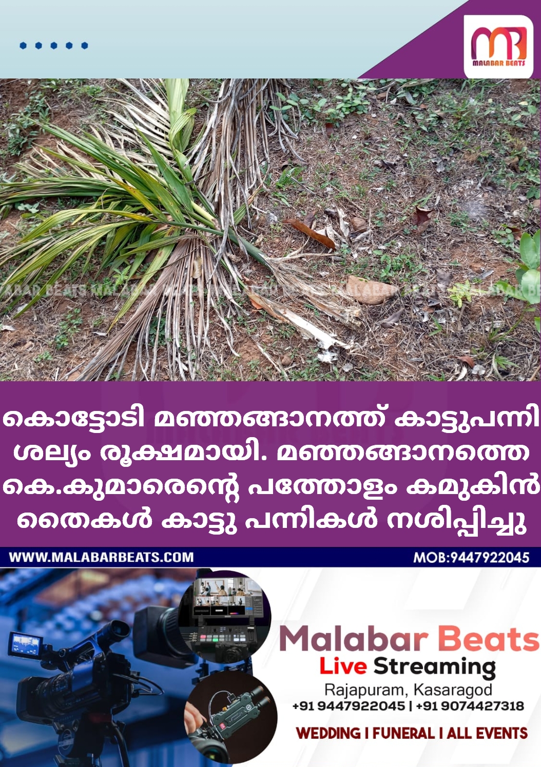 കൊട്ടോടി മഞ്ഞങ്ങാനത്ത് കാട്ടുപന്നി ശല്യം രൂക്ഷമായി. മഞ്ഞങ്ങാനത്തെ കെ.കുമാരെൻ്റെ പത്തോളം കമുകിൻ തൈകൾ കാട്ടു പന്നികൾ നശിപ്പിച്ചു