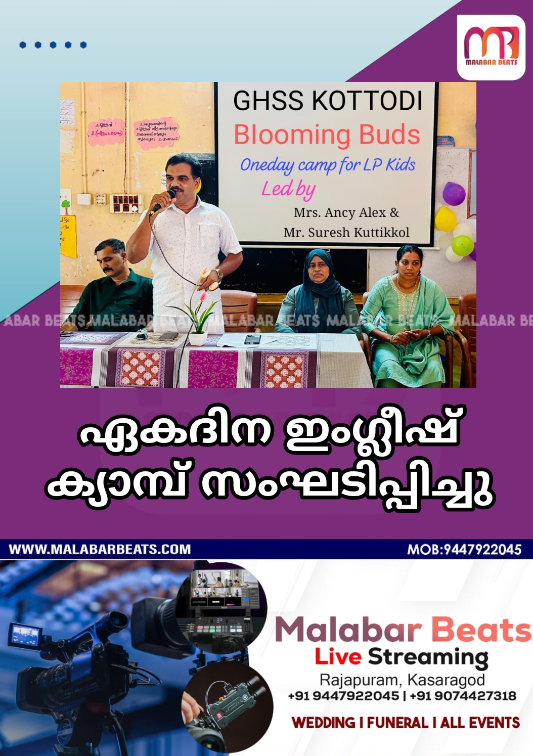 രാജപുരം : കൊട്ടോടി ഹയർ സെക്കൻ്ററി സ്കൂളിൽ എൽ പി ക്ലാസ്സുകളിലെ കുട്ടികൾക്കായി ഒരു വർഷം നീണ്ടു നിന്ന പ്രത്യേക ഇംഗ്ലീഷ് ക്ലാസുകളുടെ സമാപനമായി ബ്ലൂമിംഗ് ബഡ്സ് എന്ന പേരിൽ ഏകദിന ഇംഗ്ലീഷ് ക്യാമ്പ് സംഘടിപ്പിച്ചു. പിടിഎ പ്രസിഡൻ്റ് ശ ഉമ്മർ പൂണൂർ ഉദ്ഘാടനം ചെയ്തു. പ്രധാനധ്യാപിക അസ്മാബി എം.കെ അധ്യക്ഷത വഹിച്ചു. ബിജു കുര്യാക്കോസ് സ്വാഗതവും രാജൻ ചുള്ളി നന്ദിയും പറഞ്ഞു. എസ്എംസി ചെയർമാൻ എ.ശശിധരൻ , മദർ പിടിഎ പ്രസിഡൻറ് എം.ഷീല എന്നിവർ സംസാരിച്ചു. സുരേഷ് കുറ്റിക്കോലും ആൻസി അലക്സും ക്ലാസുകൾ നയിച്ചു.