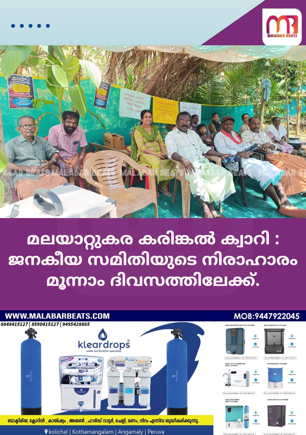രാജപുരം: കോടോം ബേളൂർ പഞ്ചായത്തിലെ ജനവാസ കേന്ദ്രമായ മലയാറ്റുകരയിൽ വൻകിട മാഫിയയുടെ നേതൃത്വത്തിലുള്ള കരിങ്കൽ ക്വാറിയുടെ പ്രവർത്തനം നിർത്തി വയ്ക്കണം എന്നാവശ്യപ്പെട്ട് ജനകീയ സമിതി നടത്തുന്ന സത്യാഗ്രഹ സമരം മൂന്നാം ദിവസത്തേക്ക് നീളുന്നു.രണ്ടാം ദിവസമായ ബുധനാഴ്ച സമര വളണ്ടിയർ ലീഡർ എം.ഡി.രാജനെ പഞ്ചായത്ത് മെമ്പറും ജനകീയ സമിതി രക്ഷാധികാരിയുമായ സജിത ശ്രീകുമാർ ഹാരമണിയിച്ചു. പി.കെ.ജയദേവൻ നായർ, എ.വി.മഞ്ജുഷ, അജിത് ചെറളം, വേണു എൻ.സി, കെ.അനിത തുടങ്ങിയവർ സംസാരിച്ചു.