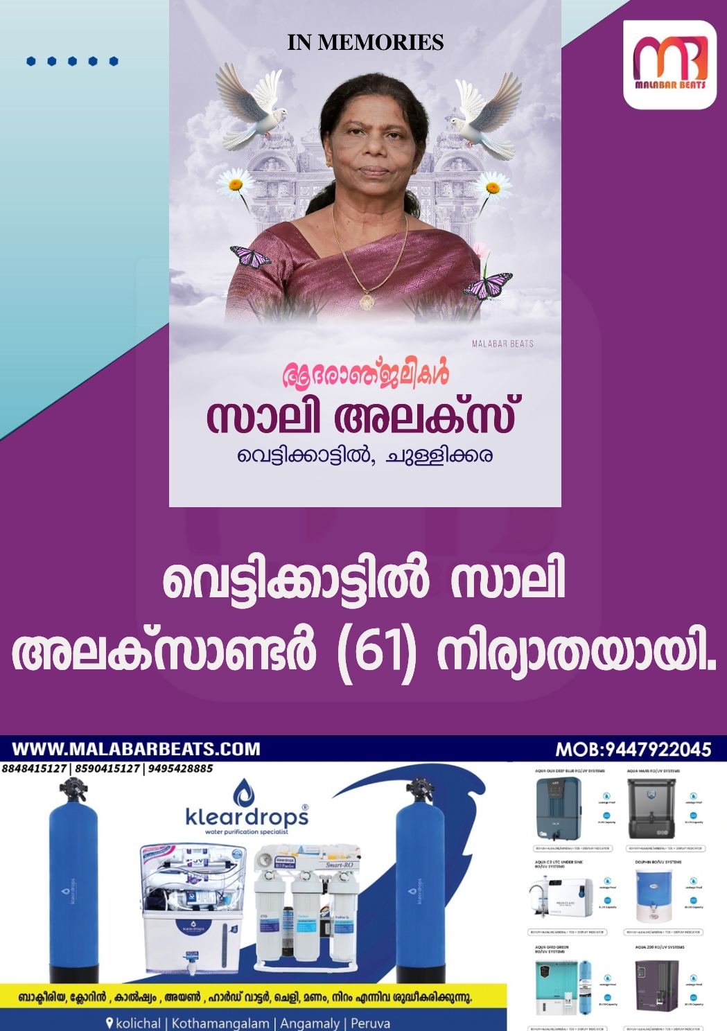 രാജപുരം :ചുള്ളിക്കര വെട്ടിക്കാട്ടിൽ സാലി അലക്‌സാണ്ടർ (61) നിര്യാതയായി.മ്യതസംസ്കാരം ഏപ്രിൽ 21ന് ഉച്ചകഴിഞ്ഞ് 3 മണിക്ക് ചുള്ളിക്കര സെൻ്റ് മേരീസ് ക്നാനായ കത്തോലിക്ക പള്ളിയിൽ. ഭർത്താവ്: വെട്ടിക്കാട്ടിൽ അലക്സ്. മക്കൾ: സോയ അലക്‌സ് (യുകെ), ഡോ.വിനയ അലക്സ് (യുകെ), അഡ്വ.ആഷ്‌ന അലക്‌സ്. മരുമക്കൾ: നവീൻ ഏബ്രഹാം കുടുംന്തനാംകുഴിയിൽ (യുകെ), ജോൺ ഷാജു കുടിലിൽ (യുകെ).